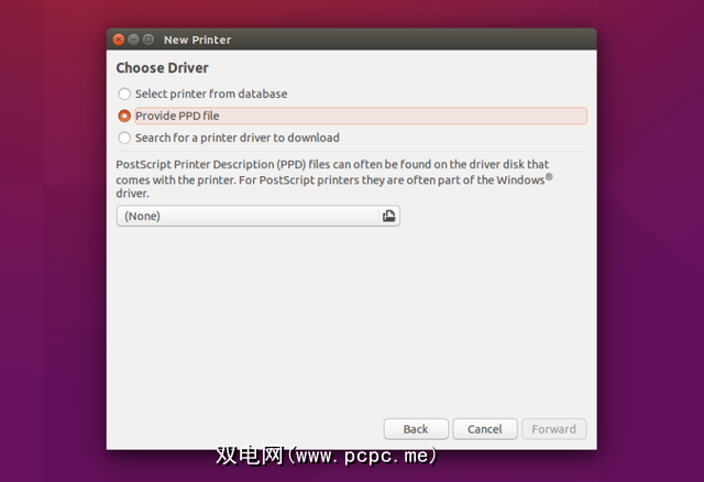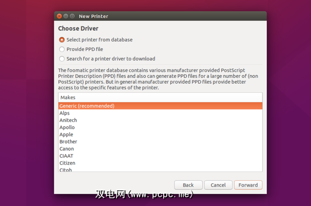 例如,要在Foomatic中搜索Ubuntu中的驱动程序,请转到系统设置>打印机。在此处,按 + 或添加按钮。选择您的串行端口,然后按转发。然后,您应该会看到一个屏幕,提示您选择打印机的品牌和型号。