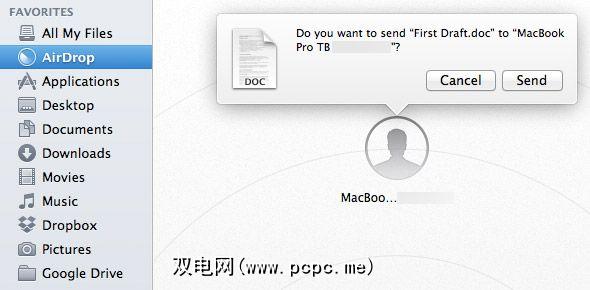任何进入AirDrop的用户都可以加入此视图,并且可以看到其他AirDrop用户。现在,共享文件就像将其拖到另一个用户的图标上一样容易。用户接受后,文件即开始传输。这适用于所有大小的文件。大型电影文件可以通过这种方式共享,但是AirDrop也可以用于几乎立即共享小文件。您知道,那些通常会通过电子邮件发送给自己的文件。