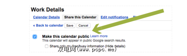 为此,请点击您要共享的日历旁边的箭头,然后单击共享此日历。 在设置页面上,选择将此日历设为公开。 ,任何人都可以查看每个事件的完整详细信息。如果您希望观众只能在日历上看到忙/闲时段,请选择仅共享我的忙/闲信息。