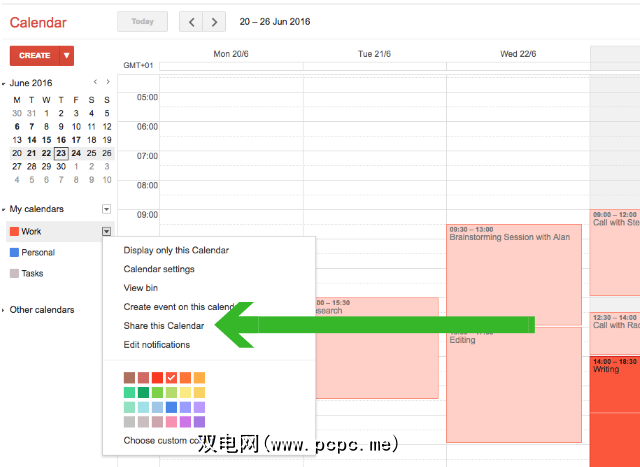 要停止与特定人员共享日历,通过点击Google日历主页上的共享此日历链接返回到设置页面。
