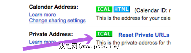 向下滚动到私有地址部分,然后点击 iCal图标。 复制显示的URL (右键单击该URL,然后单击“复制")。将此URL 发送给您想要与之共享日历的人。