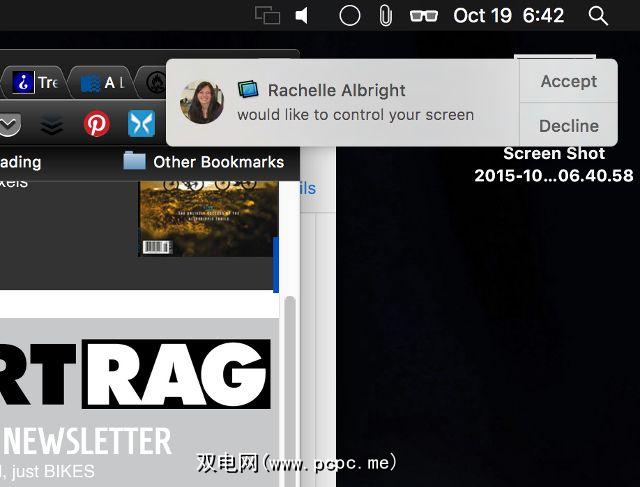 从这里,您可以在桌面上显示您想要的任何联系人,他们会像您看到的那样。您还可以通过单击菜单栏中的屏幕共享图标(看起来像两个正方形重叠的图标)来控制联系人的屏幕。
