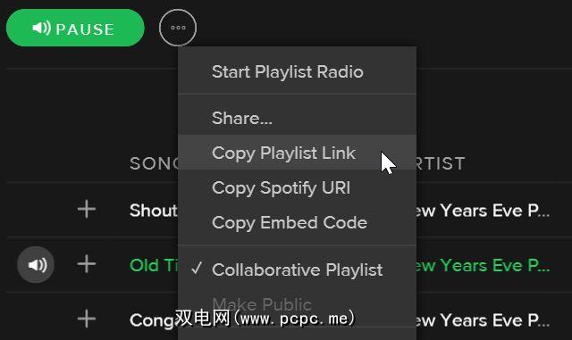 这会使当前选择的播放列表成为协作播放列表,因此您的任何朋友现在都可以在他们处于播放状态时在该播放列表上进行“协作"您的聚会。