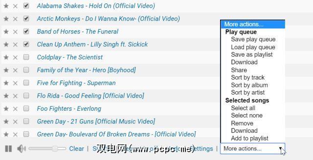 您可以选择在Subsonic播放列表中选择要播放的歌曲,然后将它们控制到Chromecast TV。服务器PC,然后使用更多操作…下拉框修改或播放排队的歌曲。