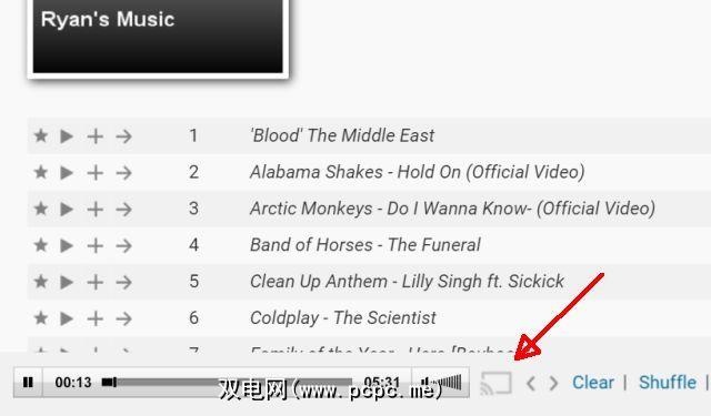 您可能已经知道,当您在YouTube上发布音乐视频(或任何视频)时,可以进行投射通过单击“最大化"按钮旁边的视频播放器控制菜单中的Chromecast图标。