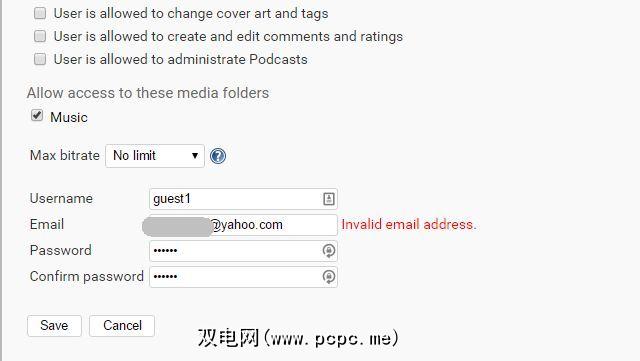 确保选择具有所需权限的框-让它们选择并选择接下来要播放的音乐文件。您还可以根据需要允许他们将音乐文件从其移动设备复制到您的Subsonic服务器。