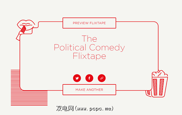 FlixTape可以非常轻松地创建自己的电影播放列表。整个过程分为四个步骤。首先,只需访问 FlixTape网站[网址删除已删除] 。然后它将提示您命名编译。这必须以“ The"开头,以“ FlixTape"结尾。我选择了“政治喜剧FlixTape"。