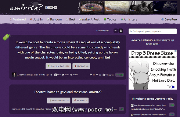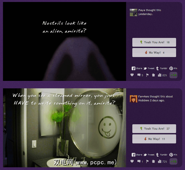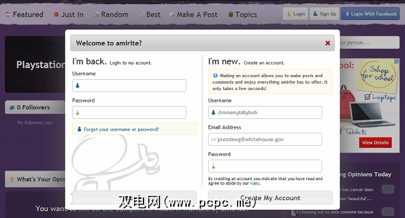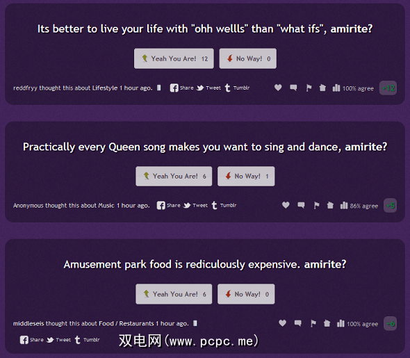 您可以与Amirite及其互动大批有思想的用户,甚至没有注册用户帐户。但是保持匿名状态意味着您只能添加一个意见和/或对他人的意见进行投票。