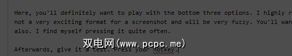 在这里,您肯定会喜欢使用它的。底部三个选项。我强烈建议您将图像类型更改为PNG,因为PNG会保留图像质量。 JPG对于截图不是一种非常令人兴奋的格式,并且会非常模糊。您还需要将Snap键设置为易于记忆且易于触及的位置。我发现自己经常按下它。
