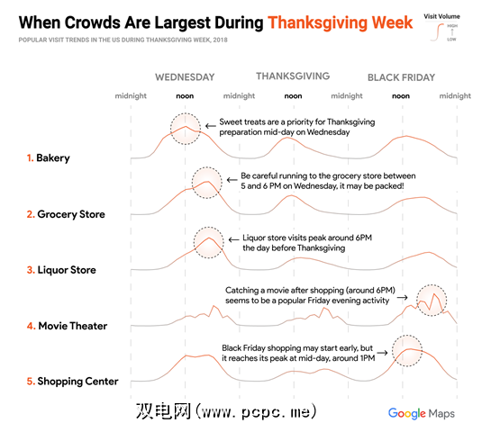搜索分析和去年的 Google位置记录用于编制所有地点的地图人们在假期周访问。与非假日周相比,这是对即将到来的最佳和最糟糕时间的深刻了解。