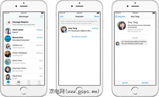 您现在可以在Facebook上向完全陌生人发送消息,并且完全陌生人可以向您发送消息。您或他们所需要的只是一个名字。现在,以这种方式发送的任何邮件都将显示为位于收件箱顶部的“邮件请求"。然后,您可以决定接受还是忽略它。