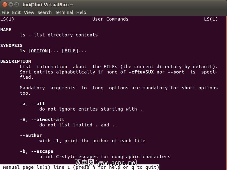 man ls您将看到冗长的详细说明用于页面的ls命令。使用箭头键和Page Up和Page Down键浏览ls命令的手册页。