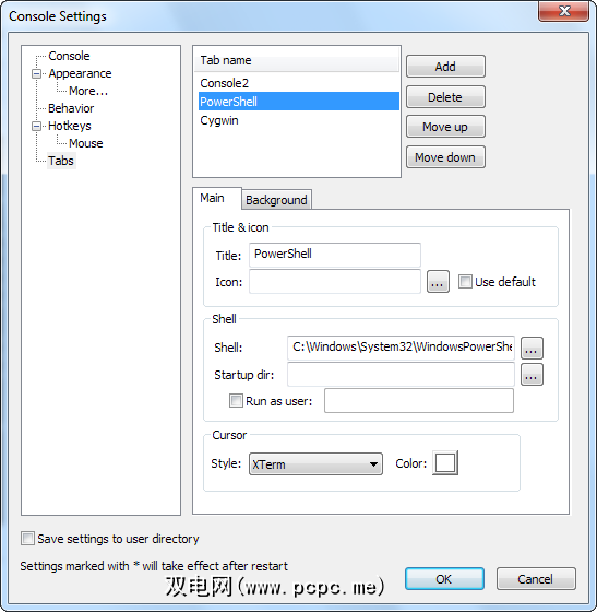 Use the Tabs section in Console’s window to configure new tabs for each environment. If you’re creating a PowerShell tab, you’ll find PowerShell at C:\Windows\System32\WindowsPowerShell\v1.0\powershell.exe. If you’re creating a Cygwin tab, you’ll find Cygwin’s Bash shell at C:\cygwin\bin\bash.exe, unless you installed it to a different location.