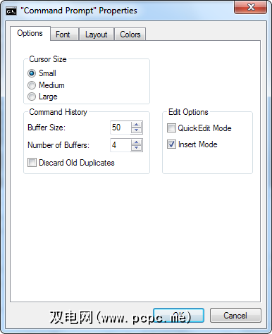 您可能不知道这一点,因为Microsoft很好地隐藏了它,但是默认的命令提示符窗口有一些设置。右键单击其标题栏,单击属性,您会看到它们。