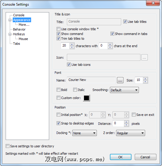 控制台可提供更多的可配置性。与命令提示符不同,它默认将设置保存到与程序位于同一目录下的名为 console.xml 的文件中。这使Console变得完全可移植-将其文件放在USB记忆棒上,您就可以在任何计算机上使用自定义设置。