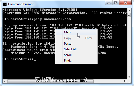 在Microsoft的命令提示符中复制文本需要右键单击并单击标记,然后再用鼠标选择文本。