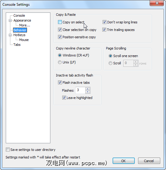 控制台的复制行为是完全可定制的。默认情况下,它使用Shift和鼠标左键开始复制-无需右键单击。您甚至可以启用“选择时复制" 选项,控制台将在您选择文本后立即将其复制到剪贴板。这是Linux书中的技巧。