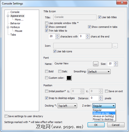 如果您使用的是命令行,则可能希望它显示在其他窗口的顶部。如果没有第三方实用程序,则无法使用默认的命令提示符执行此操作。在控制台中很简单–只需更改外观设置窗格上的 Z顺序选项即可。