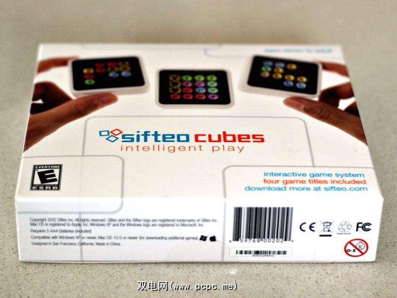 Sifteo Cubes智能游戏系统具有很强的吸引力。框,书中所有可能的醒目元素。包装盒的反面包括产品的其他照片,随附游戏的图标,所有可用的Sifteo Cubes动作和动作的插图,甚至可以扫描QR码以“观看Sifteo Cubes的动作"。