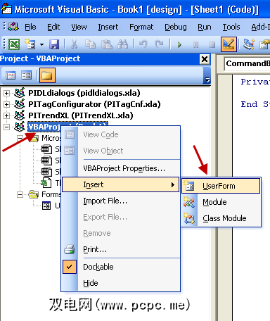 这是您将在其中创建新应用程序的开发区域。您要做的第一件事就是设置应用程序的前屏幕。为此,请右键单击已打开的项目-在我的情况下,默认名称为“ VBAProject"。然后,选择“插入"和“用户窗体"。