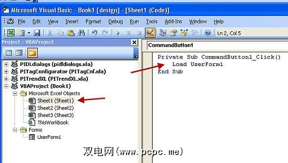 双击“ Sheet1"。这是在电子表格后面创建命令按钮的“代码"。在右侧面板上,您应该已经选择了“ CommandButton1"和“ CommandButton1_Click"代码。