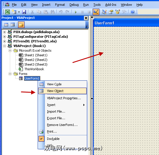 要设计表单,请右键单击“ UserForm1",然后选择“查看对象"。您会在屏幕的右侧看到实际的表单本身。您可以单击表单并拖动边框线以根据需要调整其大小。