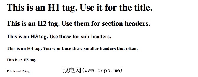 。例如,本文中标记的名称是二级标题。<h1>Big and Important Header</h1><h2>Slightly Less Big Header</h2><h3>Sub-Header</h3>