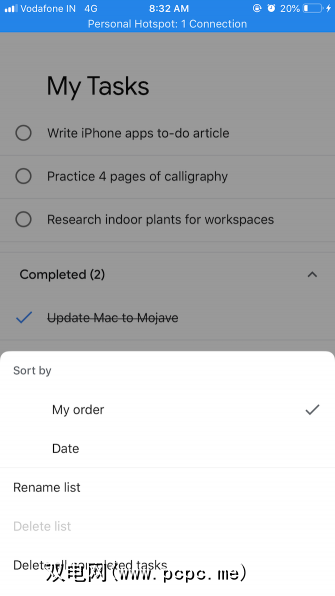 右下角的省略号图标为您提供了重命名/删除当前列表以及按日期对任务进行排序的选项。如果您要切换列表或创建新列表,可以在左下角汉堡包图标后找到相关选项。