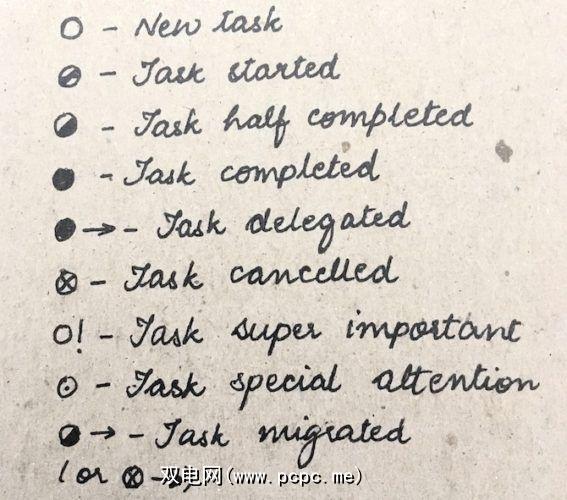 您从列表中每个任务旁边的空心圆圈开始。在一天结束时,您将根据在任务上取得的进展来填写圆圈。例如,如果您已完成任务,则使该任务旁边的圆圈变暗。如果任务被取消,则在任务旁边的圆圈上打一个“ X"标记。对于您委派的任务,请使相应的圆圈变黑并在其旁边添加一个向右箭头。