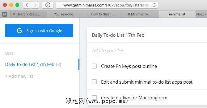极简主义生活在网络上。您无需注册即可创建待办事项列表,但您可以将应用程序连接到您的Google帐户。