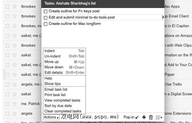 要启动Google任务,请单击Gmail收件箱侧边栏上方的 Gmail ,然后选择任务从下拉菜单中。您会在右下方看到一个小面板。您可以在这里列出当天的任务,然后逐一检查。最小化“任务"面板以使其不可见并且易于访问。