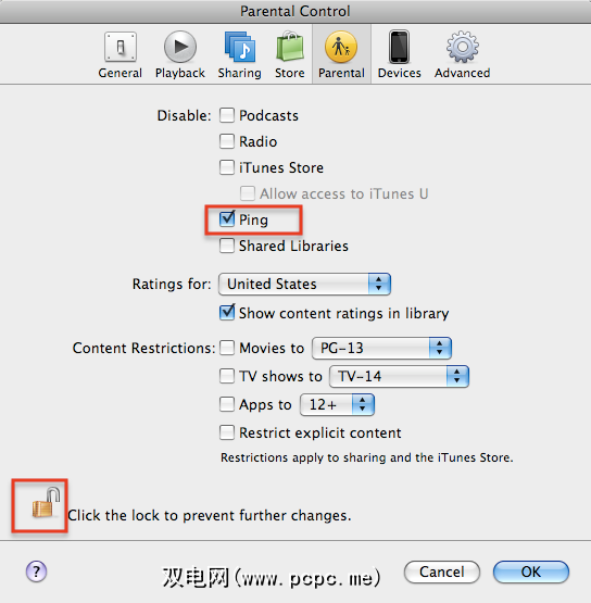 转到 iTunes>“首选项" ,然后单击“ 父母控制" 。在要禁用的服务的选项列表中,选中“ Ping"复选框并保存。如果您要禁用Ping以保护您的孩子不使用它,显然,您还应确保已将“家长"设置锁定。
