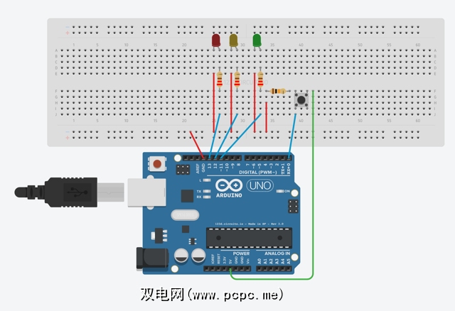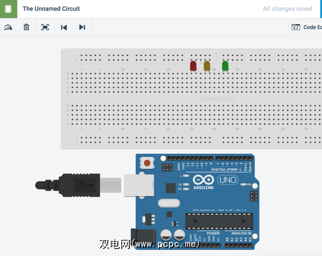 现在将所有连线连接起来。要添加导线,只需单击面包板上的任意位置,而无需先单击组件(您也可以使用“ breadboardwire"组件),然后在面包板或Arduino上单击所需的空间连接您可以按照与LED相同的方式更改颜色;使用工作区右上角的下拉菜单。