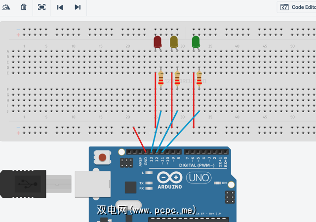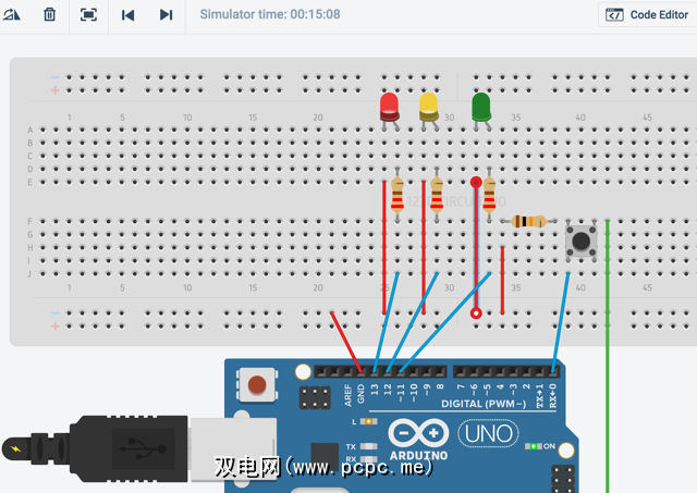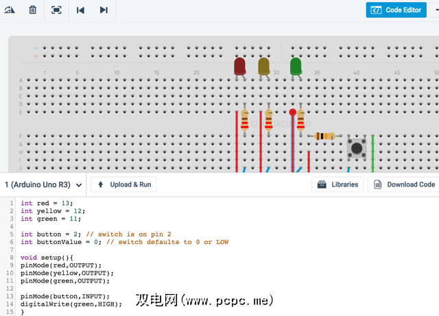 此后,点击上传并运行,您将拥有一个工作的虚拟Arduino交通灯!