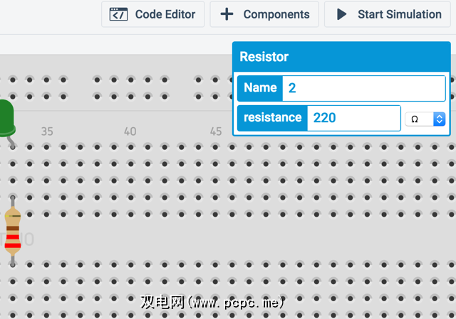 要选择每块电阻,可以使用屏幕右侧的组件选项框。进行调整后,电阻器上的色带将改变颜色以反映电阻(也请确保选择正确的单位)。