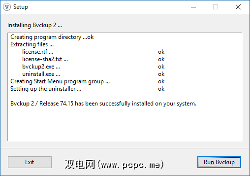 继续并单击安装。您会很快看到该程序本身的安装故障,但这很快。为我安装了几秒钟,这只是显示了Bvckup 2的轻巧程度。现在,点击运行Bvckup 即可完成操作。