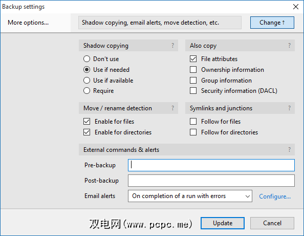 最后,在更多选项... 旁边,点击更改。本部分允许您选择其他因素,例如是否应复制文件的所有权信息,如何处理卷影复制,移动检测等等。 电子邮件警报下拉列表特别值得注意,如果备份失败,该下拉列表将有助于发送消息。