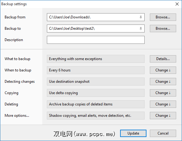 向下移动,检测更改复制都有两个选择,其中有详细说明。如果您最重视备份速度,则将这些选项保留为默认值。如果要使备份尽可能安全可靠,请在后面的部分中选择完整复制文件。备份将花费更长的时间,但这意味着在严重故障的情况下减少了数据丢失的风险。