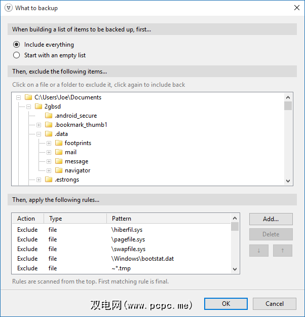 现在是时候更深入地研究备份的特定参数了。首先,通过单击要备份的内容旁边的详细信息…来确切指定要备份的内容。在这里,您可以缩小要包含在备份中的子文件夹和文件。您还可以通过点击相关部分中的添加…来应用规则。规则从顶部开始应用,这意味着下面发生冲突的所有内容都将被忽略。您可以根据特定属性包括或排除文件,例如文件是只读或压缩的,也可以手动输入文件名或扩展名。完成操作后,点击确定。