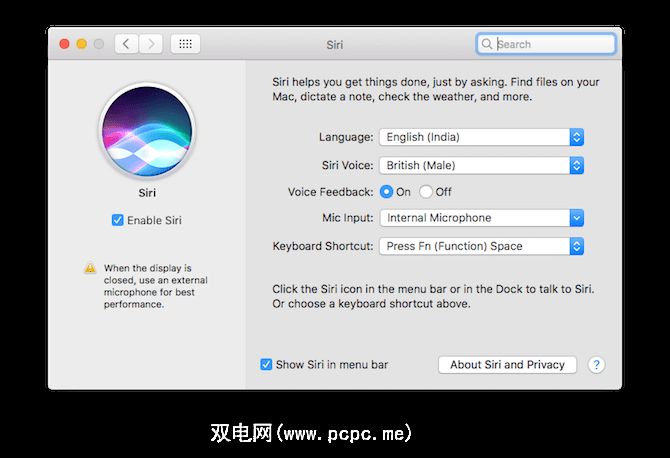 您会在Dock中找到一个Siri快捷方式(同样,也可以通过将图标从Dock上拖动来移动),并且还有一个键盘快捷方式也是如此。 Siri的首选项窗格使您可以通过按住 Option 键或 Command + Space 组合键来调用Siri。您还可以通过点击 Fn 和 Space 按钮来选择调用Siri。