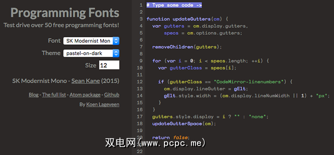 此精彩的网站提供了50多种不同的等宽字体,您可以使用简单的下拉菜单进行预览。您可以将预览文本更改为任意文字,可以更改字体大小,甚至可以从20多种不同的配色方案中进行选择。