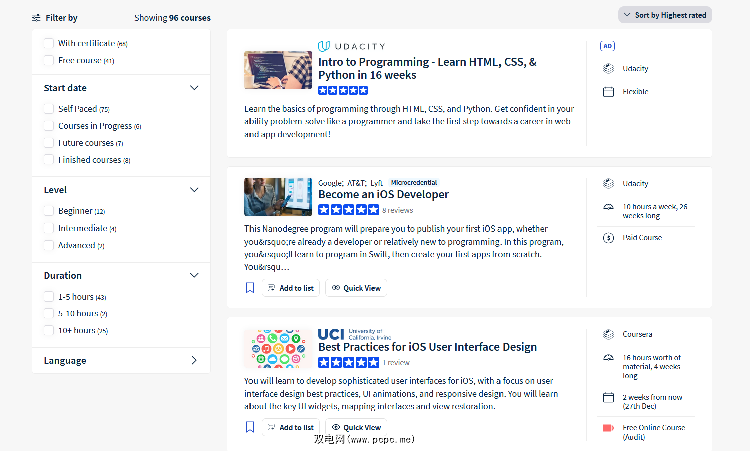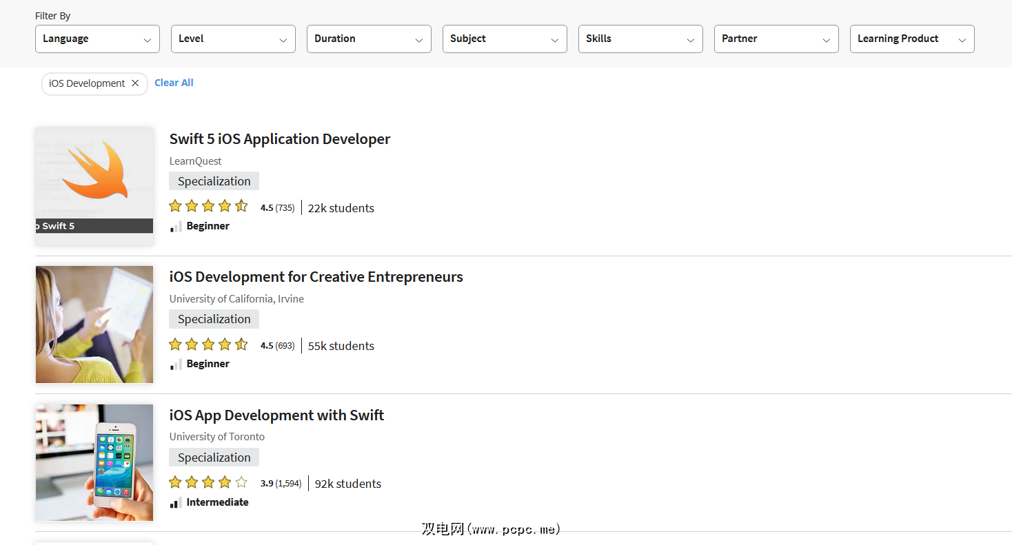 Coursera 与 Class Central 非常相似,因为它列出了不同职业道路的培训提供商,而不仅仅是 iOS 开发。您也可以在此处使用过滤器,并根据您的情况获得最佳建议。