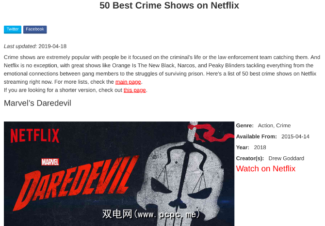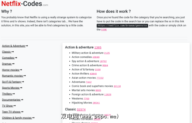 此网站是检查Netflix中所有秘密类别的最令人赏心悦目的且有条理的方式。您会获得更大的类别(例如:动作和冒险,惊悚片,纪录片,喜剧等)以及每个子类别(例如:武术电影,LGBT戏剧,深海恐怖片,军事纪录片等)。 )。链接旁有可用的链接,您可以单击它并在Netflix中浏览。