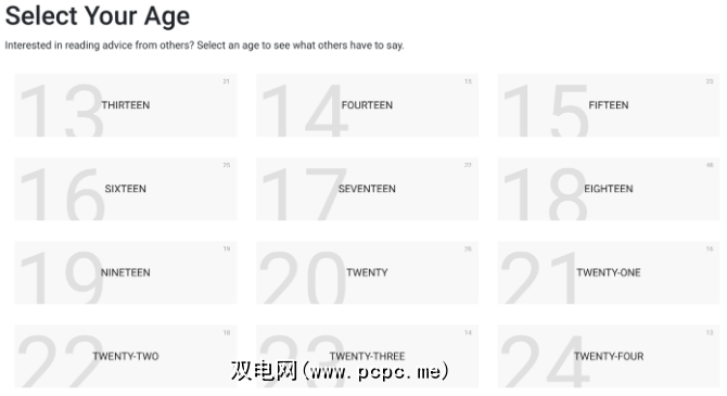 您需要做的就是从13岁以上的年龄中选择您当前的年龄。下一页将为您提供所有不同年龄的人们所希望的关于该年龄的建议。从刚过去那年的人到年龄甚至两倍的人,这都是各种各样的观点。他们根据投票和否决进行排名。