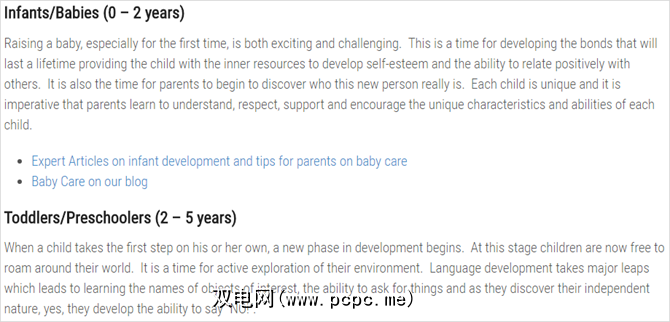 尽管您可能需要对所需的区域进行一些调整,但是一旦到达该区域,您将感到满意文章的选择和质量。最简单的开始方法是从顶部导航中选择专家文章,然后单击儿童发育的年龄和阶段。此部分按孩子年龄进行划分,并包含指向该年龄的专家文章的链接。