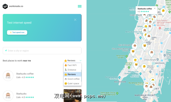 WorkMode是基于Google Maps及其基础构建的超级简单的Web应用程序数据。这个界面一目了然,您可以轻松找到附近提供Wi-Fi以及其他便利设施的咖啡馆。结果将显示在该地区的Google地图上,您可以根据距离,快速Wi-Fi,咖啡质量,安静程度或评论进行过滤。