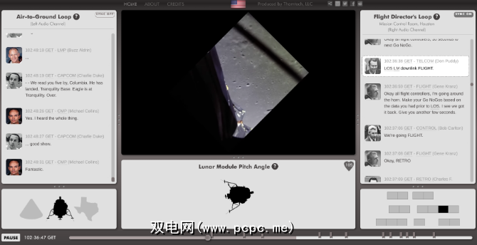 左侧窗格显示了地球上的宇航员和工程师的空对地循环,而飞行主管的循环则显示了任务控制室正在谈论(以及谁是)。还会显示“农历"模块的俯仰角,而大屏幕则显示正在回射的图像。