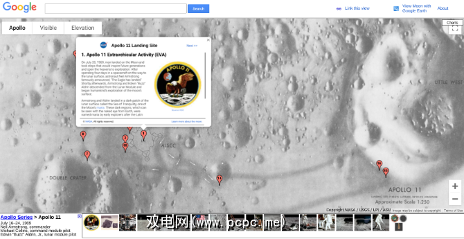 但是不要在这里浪费太多时间,因为最酷的部分是Google Moon的Apollo 11任务。月球表面上的18个绘图点绘制了前两个探险者的行进路线以及他们所做的事情。这是登月最酷的互动展品之一。