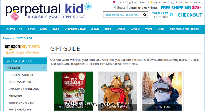 PerpetualKid是一家有趣的商店,里面有许多不寻常的礼物。您是否曾经想过找到一家针对喜欢美人鱼,粉红色的火烈鸟,培根或甜甜圈的商品的商店?如果没有,那么您就错了,因为PerpetualKid拥有它们。您可以查看“礼品指南"部分中的这些独特类别,或浏览玩具,装备,家居和新商品。