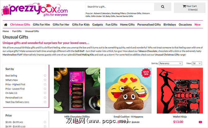 Prezzybox.com是没有人期望获得礼物的另一家很棒的商店。该网站有适合各种场合和年龄的礼物。但是,当然,当您要购买非同寻常的商品时,必须前往其“独特礼物"部分。要到达那里,只需点击顶部有趣礼物链接中的不寻常的礼物。